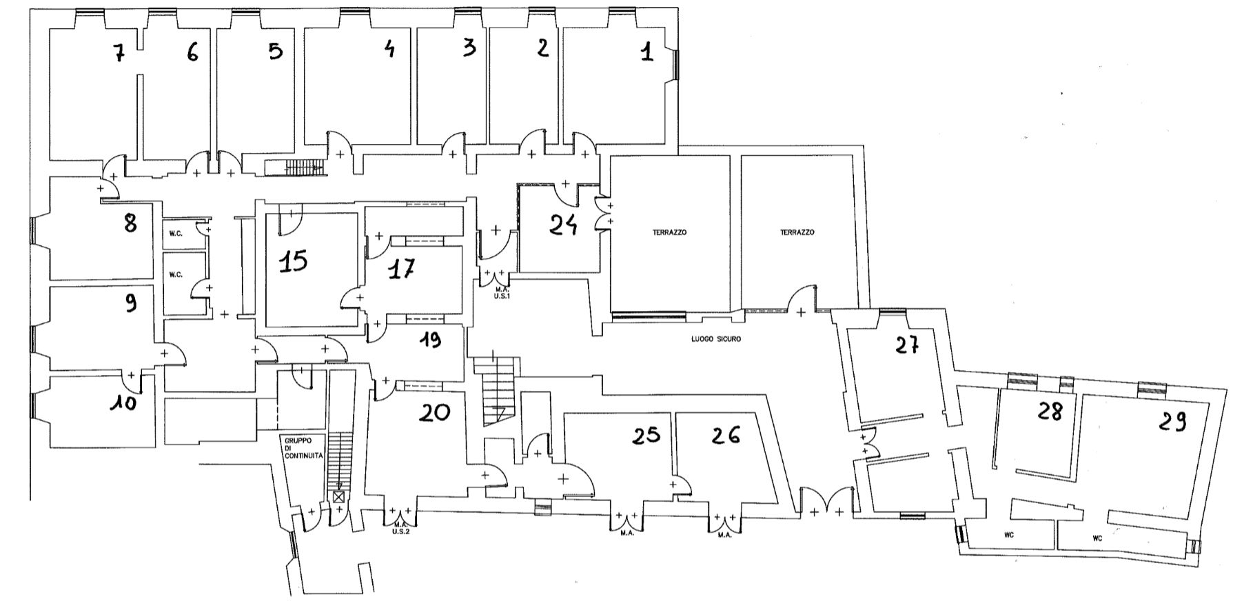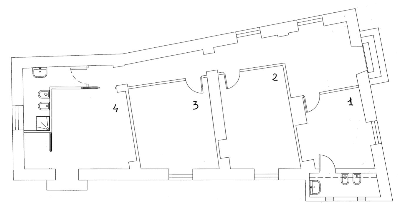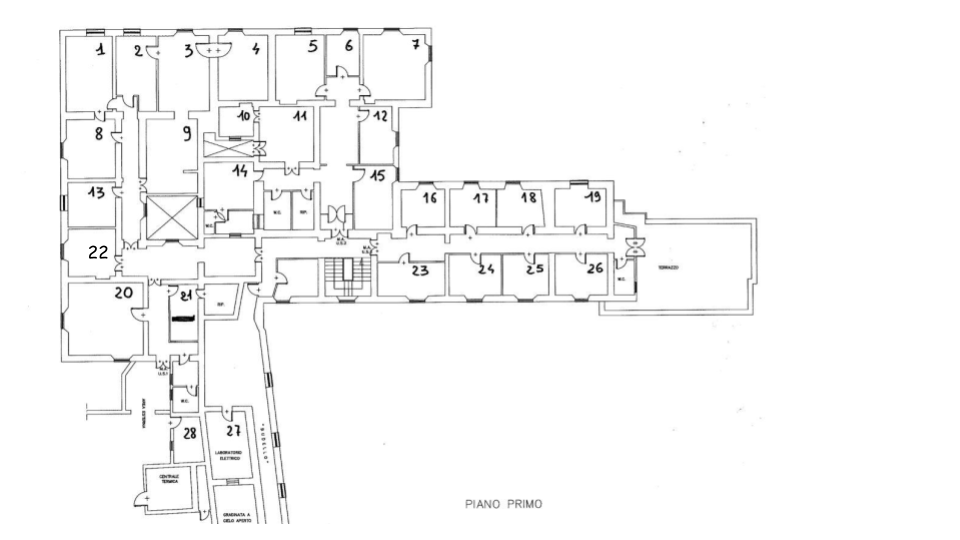 Per le stanze la prima cifra indica il piano, la lettera l’edificio e le ultime due cifre il numero della stanza. Si veda la piantina come riferimento.