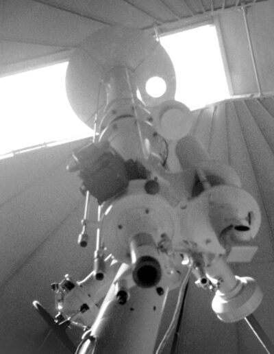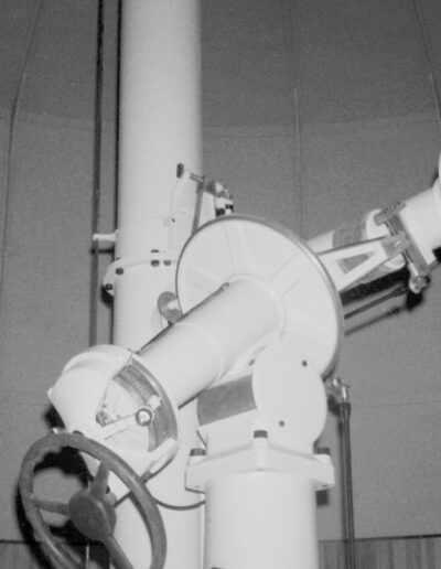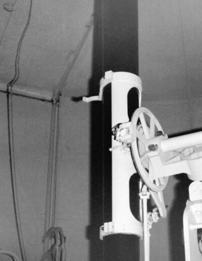 4 – Telescopio rifrattore Salmoiraghi di 20 cm di diametro e 3 m di focale con in parallelo un filtro interferenziale di Lyot in Hα – cupola est. Fu acquisito, nel 1972, come donazione dell’ing. G. Cenzato all’Osservatorio e impiegato per lo studio dei fenomeni solari (foto 1977).