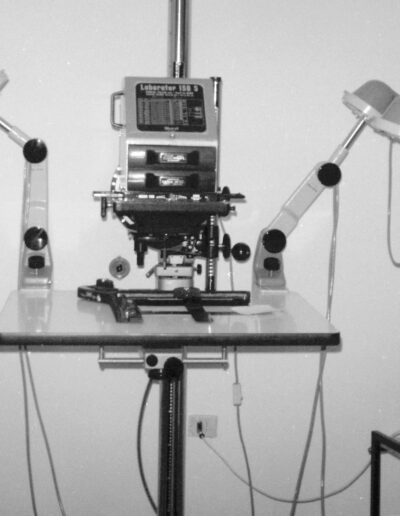 9 – L’ingranditore del laboratorio fotografico per la stampa delle pellicole negative. Era ancora in uso il procedimento fotografico chimico di sviluppo e stampa dei negativi sostituito poi da quello digitale (foto 1977).