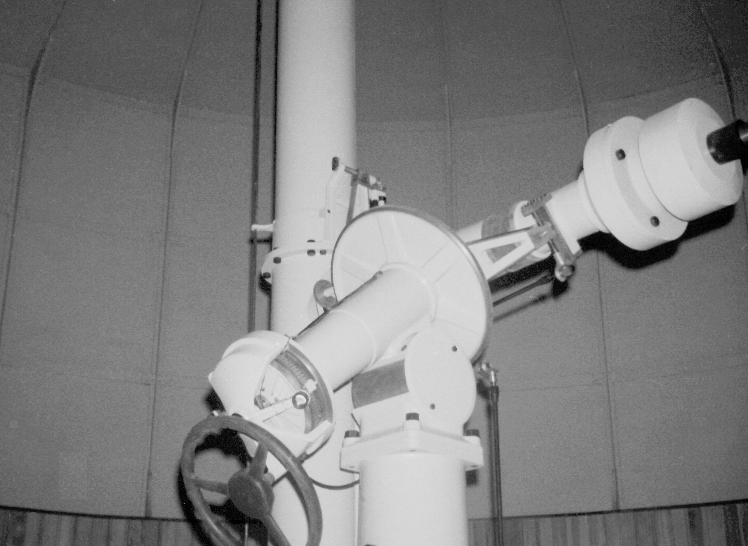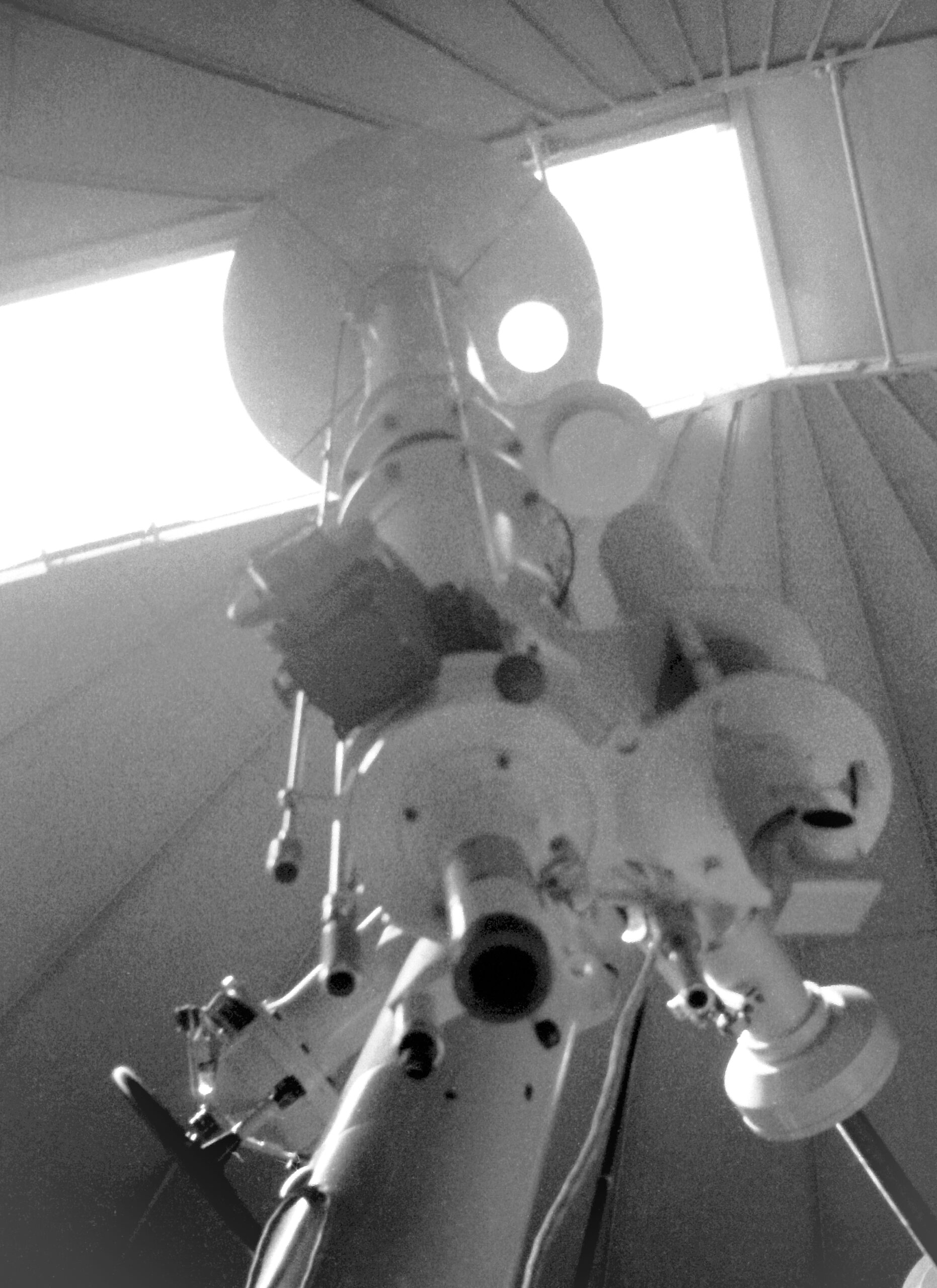 4 – Telescopio rifrattore Salmoiraghi di 20 cm di diametro e 3 m di focale con in parallelo un filtro interferenziale di Lyot in Hα – cupola est. Fu acquisito, nel 1972, come donazione dell’ing. G. Cenzato all’Osservatorio e impiegato per lo studio dei fenomeni solari (foto 1977).