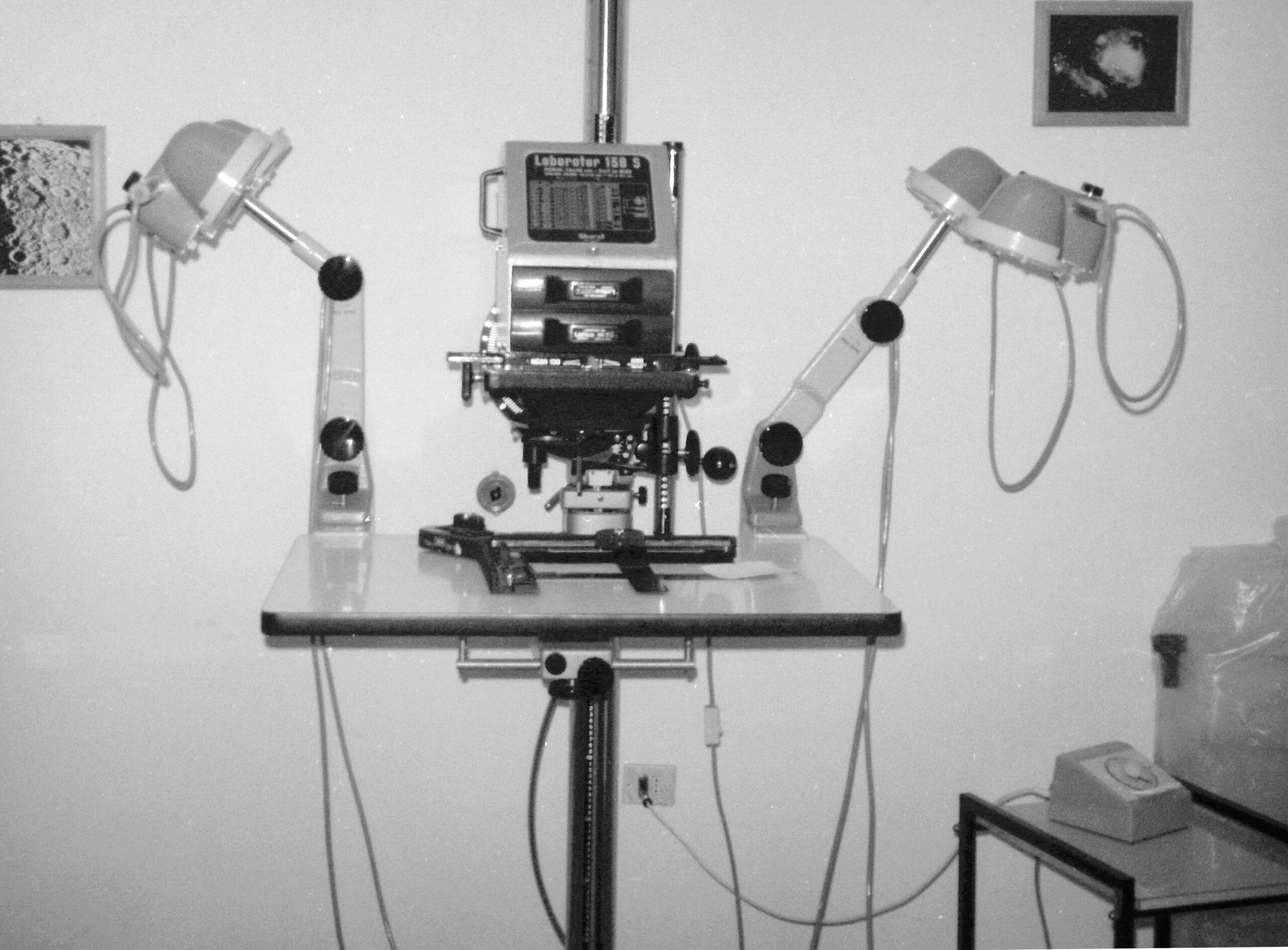 L’ingranditore del laboratorio fotografico per la stampa delle pellicole negative. Era ancora in uso il procedimento fotografico chimico di sviluppo e stampa dei negativi sostituito poi da quello digitale (foto 1977).